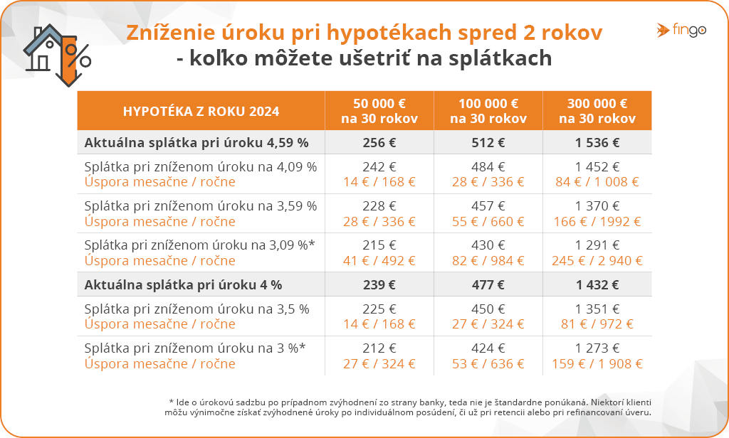 Príklad: Pri hypotéke 100-tisíc eur môže rozdiel v úroku 0,5 % znamenať úsporu mesačne 27 eur, pri rozdiele o 1 % ide už o 54 eur a pri 1,5 % dokonca 80 eur, čo predstavuje stovky eur ročne. Pri väčších, 200-tisícových či 300-tisícových úveroch úspory dosahujú stovky eur mesačne a tisícky eur ročne.